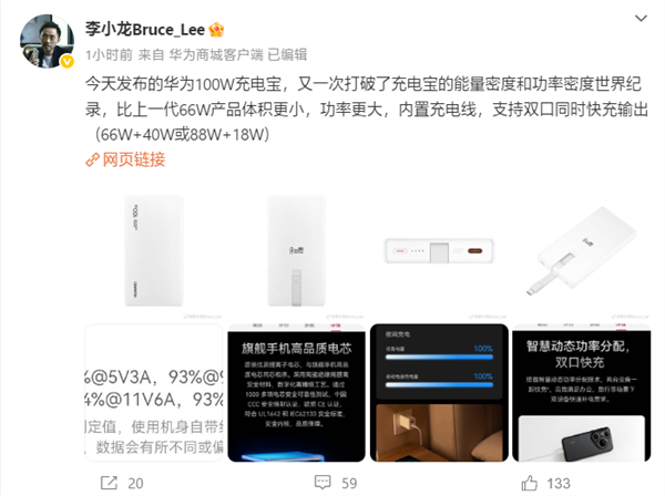 另外,华为终端BG CTO李小龙还发文补充称,该产品又一次打破了充电宝的能量密度和功率密度世界纪录。
